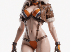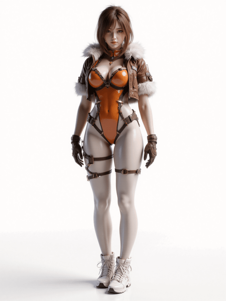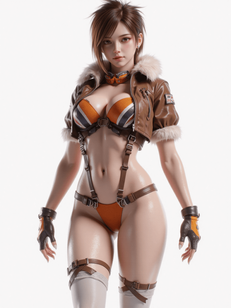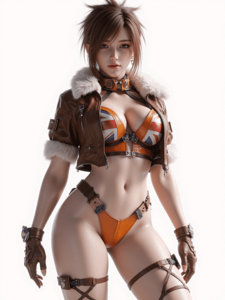 1girl,brown hair,brown eyes,medium breasts,swept bangs,bangs,short hair,spiked hair,chest harness,vambraces,gloves,tight,sleeves rolled up,shoes,fur trim,tight pants,leather,leather jacket,brown jacket,pants,clothes writing,short sleeves,skin tight,strap,breasts,ear piercing,brown gloves,white footwear,black gloves,union jack,goggles,bomber jacket,orange goggles,orange bodysuit,jacket,bodysuit,cross-laced legwear,harness,cross-laced clothes,