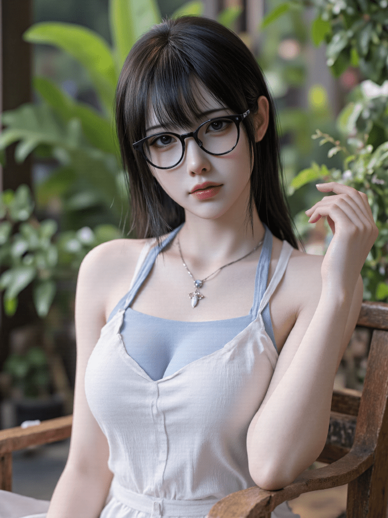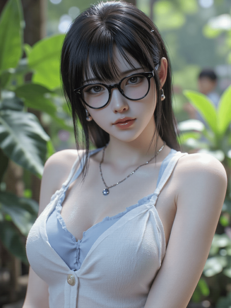 The image features a young woman with long,straight dark hair that falls gracefully over her shoulders. Her hair is neatly parted in the middle,framing her face beautifully. She has a fair complexion and delicate facial features,including large,expressive eyes that are accentuated by subtle makeup. Her lips are naturally pink,adding to her gentle and approachable appearance. She is wearing a light blue top layered under a white,textured sleeveless dress,which gives off a fresh and summery vibe. A delicate necklace with a small pendant adorns her neck,complementing her outfit. The background is filled with lush green foliage,suggesting an outdoor setting,possibly a garden or park,which adds a natural and serene atmosphere to the scene.,