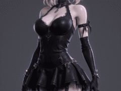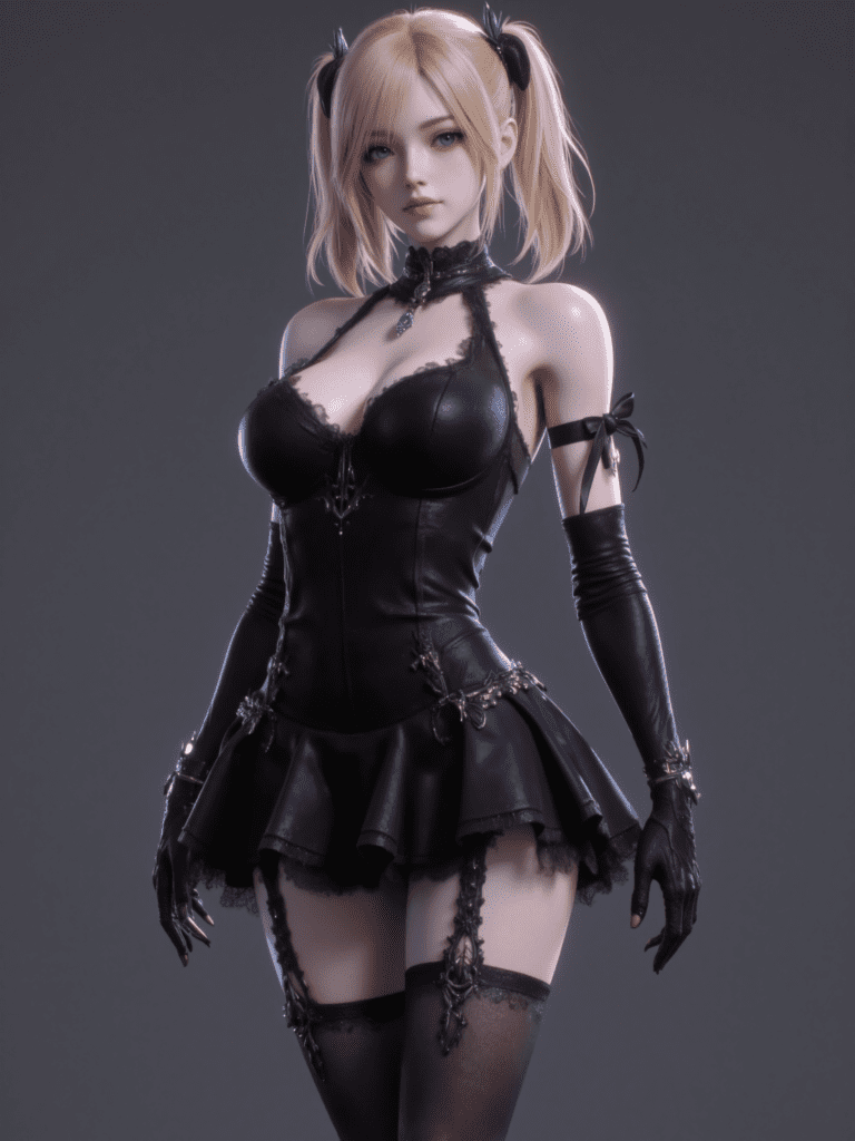 ani,twintails,blonde hair,blue eyes,choker,bare shoulder,black gothic dress,arm ribbon,black gloves,asymmetrical legwear,full body,