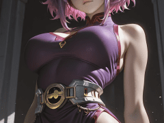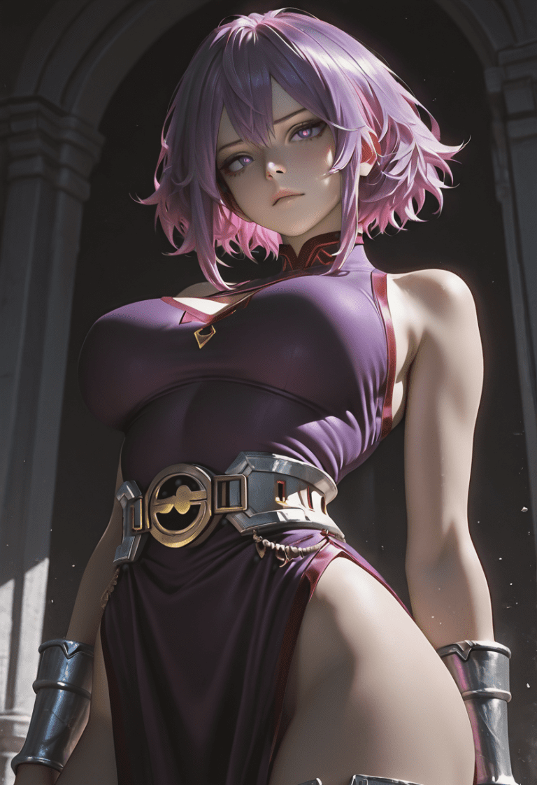 <lora:Lady_NagantKaina_Tsutsumi_-_My_Hero_Academia_-_waiNSFW:1>, source_anime, hires image, masterpiece, best quality, newest, masterpiece, best quality, 4k, 1girl, purple eyes, white pupils, purple hair, pink hair, short hair, multicolored hair, silver boots, breasts, large breasts, dress, purple dress, bare shoulders, sleeveless, belt, anime coloring dynamic pose