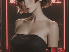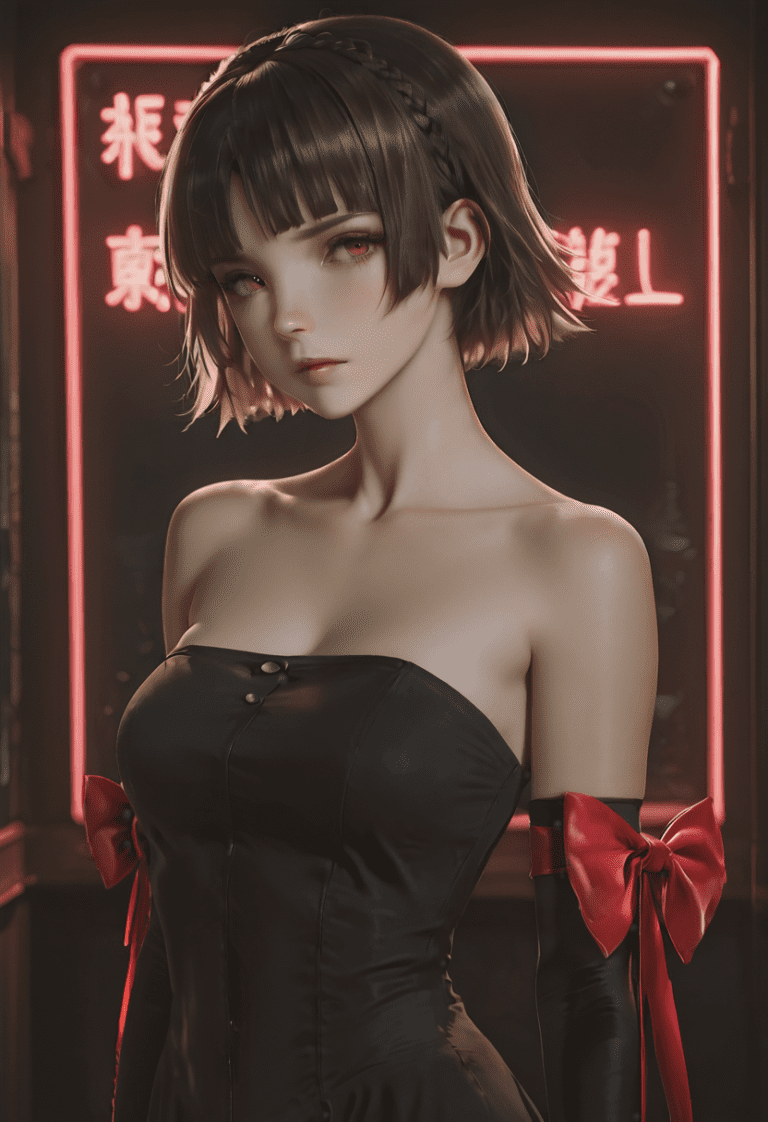masterpiece, best quality, newest, 1girl, solo, black dress, strapless red bows, elbow gloves, bare shoulders, ribbon, niijima_makoto, bar, dark background, neon lights,
