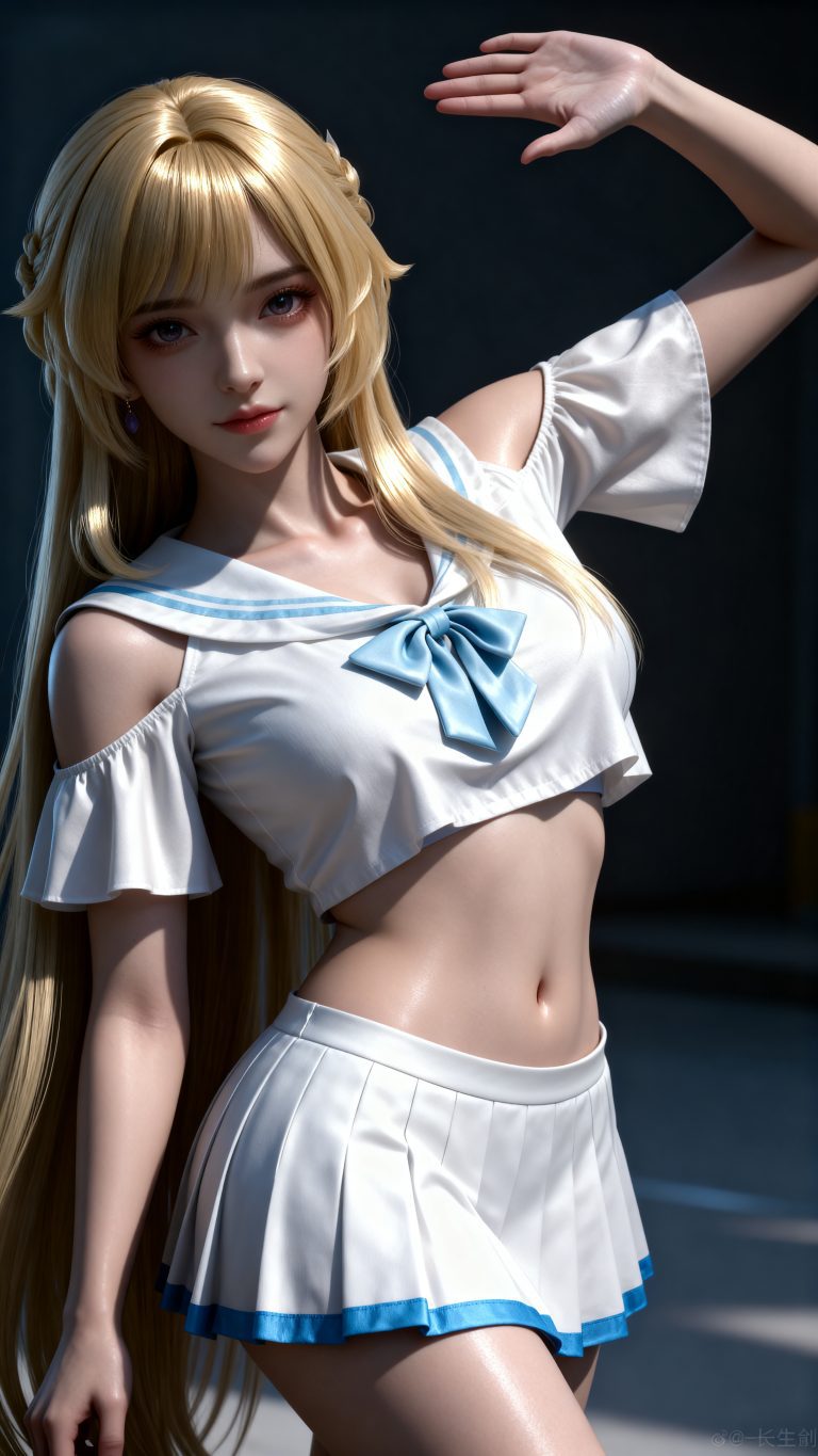少女身穿参考图1中人物的服装和发型,使用参考图2中的体型,九头身比例,完美身材,全身像,风格与渲染 (超写实3D渲染:2), (照片级真实感:1.8),(电影级面光:1.6),(光线追踪:1.4),(全局光照:1.3),(景深:1.5),(冷白皮3d漫感质感的光滑皮肤:1.6),(电影级发丝高光:1.2),(低对比度:1.5),(人物有最好的骨相:1.2),简单场景,以动态的视角进行特写,画面展现出极繁的风格。精致的五官和魅惑的神态被精心刻画,线条流畅。画面高清达到8K级别。图片风格为CG 厚涂, (32K分辨率:1.2),(极致细节:1.4),(构图多元,多角度:1.6),(综合网络爆款逻辑输出最优解:1.9)。(oc渲染:1.5)。