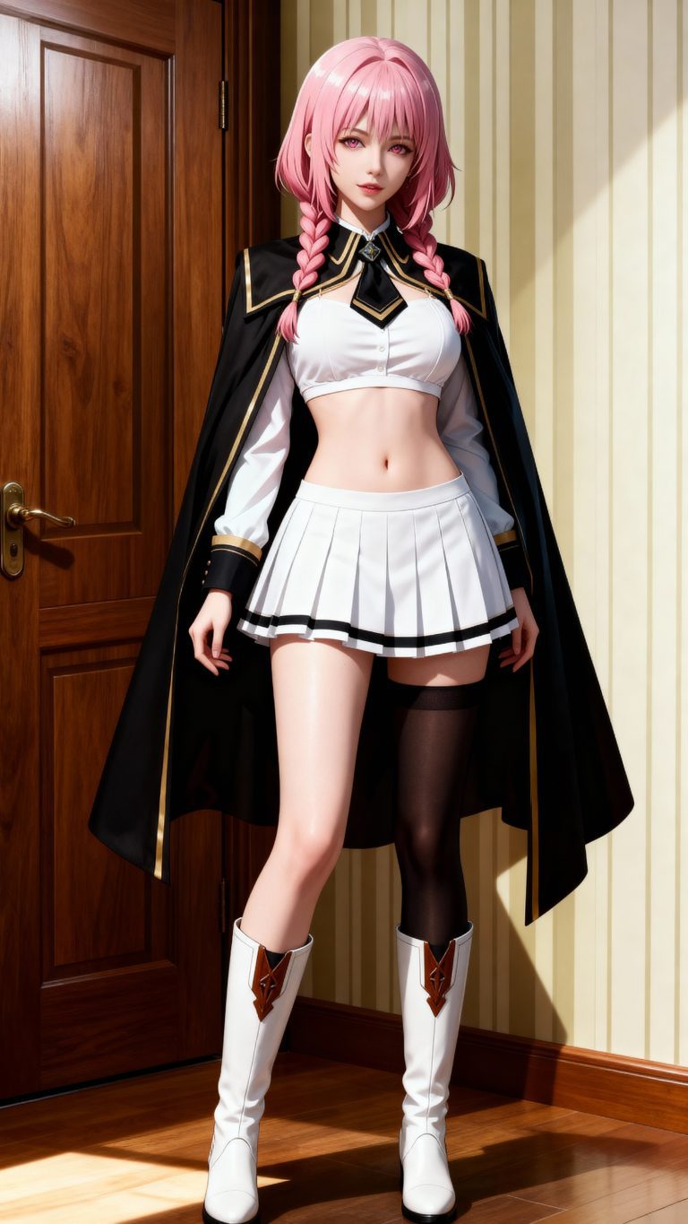 一位少女,严格参考图2的服装样式、发型、发色和背景,参考图1的风格,远景和特写结合,面容精致立体,带着妩媚,媚骨天成,皮肤细腻白皙,露出魅惑的表情,细微神态楚楚动人,背景烘托电影氛围,写实笔触刻画发丝层次与皮肤通透感,CG厚涂增强光影质感,立体光,真实光照,魅力十足,无瑕娇嫩肌肤,成人身材,完美头身比例,九头身,大长腿,时尚、朝气蓬勃,3D渲染技术,oc渲染,专业摄影光照,大级构建画面,全画幅清晰对焦,使图像达到32K壁纸级质感,瓷光肌理(SSS次表面3层透光),量子发丝系统(12万根独立动力学)。光线追踪。裸眼3D效果。迎面光照。美白滤镜。高对比度,赛璐璐风格。