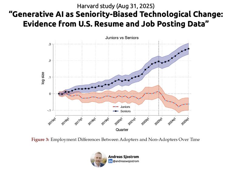 可最近的研究,像哈佛的这份,越来越戳破这层窗户纸。生成式AI一进来,低技能岗位的稳定性就先崩,尤其是底层初级岗和合同工,挤压得最狠。