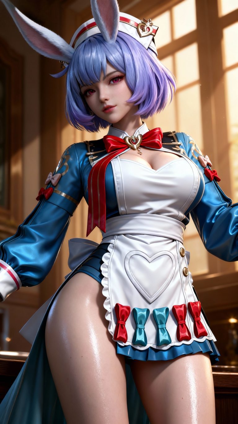 参考图2的服装样式、发型、发色和背景,画面风格参考图1,远景和特写结合,面容精致立体,带着妩媚,媚骨天成,皮肤细腻白皙,露出魅惑的表情,细微神态楚楚动人,背景烘托电影氛围,写实笔触刻画发丝层次与皮肤通透感,CG厚涂增强光影质感,魅力十足,无瑕娇嫩肌肤,成人身材,完美头身比例,九头身,大长腿,时尚、朝气蓬勃,3D渲染技术,oc渲染,专业摄影光照,大级构建画面,全画幅清晰对焦,使图像达到32K壁纸级质感,瓷光肌理(SSS次表面3层透光),量子发丝系统(12万根独立动力学),光线追踪,裸眼3D效果,美白滤镜,高对比度,鸣潮风格
