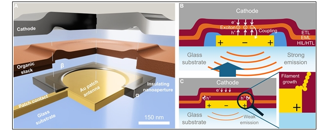 核心技术在于“光学天线”的巧妙优化。传统缩小像素时,电流易在边缘堆积,导致分布不均和短路失效。新结构在光学天线顶部添加特制绝缘层,仅中央预留直径200纳米的开口,将“问题电流”有效屏蔽,确保纳米像素稳定可靠。目前,该像素的发光效率为1%,发光颜色锁定橙色,但团队已锁定下一步计划:提升效率、扩展RGB全色域。如果一切顺利,这项技术将为便携设备注入革命性活力——想象一下,你的智能手环或AR眼镜,能在指甲盖大小的空间内,展现电影级画质!