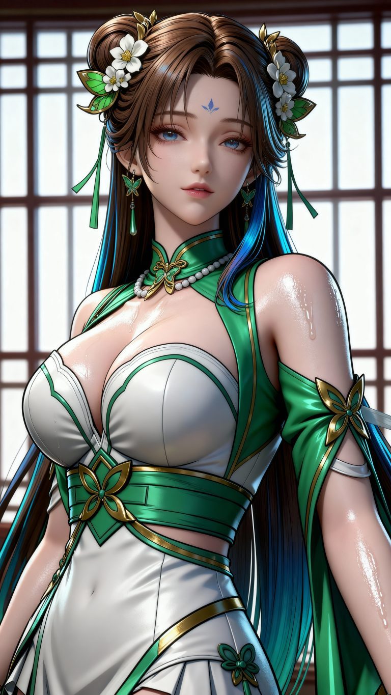 生成图片,一位少女,人物严格参考图2的服装样式、发型、发色和背景,仅仅画面风格参考参考图1,远景和特写结合,面容精致立体,带着妩媚,媚骨天成,皮肤细腻白皙,露出魅惑的表情,细微神态楚楚动人,背景烘托电影氛围,写实笔触刻画发丝层次与皮肤通透感,CG厚涂增强光影质感,魅力十足,无瑕娇嫩肌肤,成人身材,完美头身比例,九头身,大长腿,时尚、朝气蓬勃,3D渲染技术,oc渲染,专业摄影光照,大级构建画面,全画幅清晰对焦,使图像达到32K壁纸级质感,瓷光肌理(SSS次表面3层透光),量子发丝系统(12万根独立动力学)。光线追踪。裸眼3D效果。美白滤镜。高对比度,鸣潮风格。bjd质感,立体描边。湿漉漉的皮肤。90年代动画线稿风格