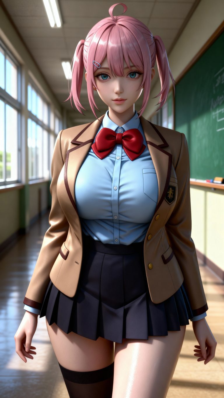 生成图片,一位少女,人物严格参考图2的服装样式、发型、发色和背景,仅仅画面风格参考参考图1,远景和特写结合,面容精致立体,带着妩媚,媚骨天成,皮肤细腻白皙,露出魅惑的表情,细微神态楚楚动人,背景烘托电影氛围,写实笔触刻画发丝层次与皮肤通透感,CG厚涂增强光影质感,魅力十足,无瑕娇嫩肌肤,成人身材,完美头身比例,九头身,大长腿,时尚、朝气蓬勃,3D渲染技术,oc渲染,专业摄影光照,大级构建画面,全画幅清晰对焦,使图像达到32K壁纸级质感,瓷光肌理(SSS次表面3层透光),量子发丝系统(12万根独立动力学)。光线追踪。裸眼3D效果。美白滤镜。高对比度,鸣潮风格。bjd质感,立体描边。湿润的皮肤。90年代日本动画上色。