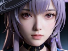 一位年轻亚洲女性,拥有精致立体的五官,人物形象参考图2,皮肤白皙细腻,质感通透,面部有细微的高光和阴影,营造出立体的面部轮廓,整体妆容精致自然,背景为深色渐变,突出人物主体,光线柔和均匀,呈现出专业摄影的质感,画面清晰锐利,细节丰富,具有3D渲染的精致效果。