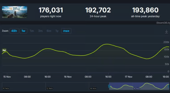 网易旗下开放世界武侠力作《燕云十六声》于11月14日正式全球公测后,迅速在Steam平台掀起热潮,玩家人数屡创新高。根据SteamDB数据,游戏在11月16日创下同时在线峰值超过19万人的惊人纪录,彻底点燃了国内外玩家的热情。