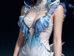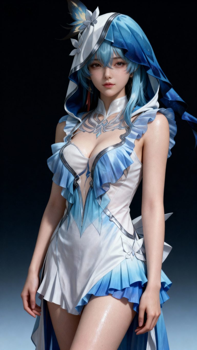 一位年轻亚洲女性,全身像,动漫转真人风格,拥有精致立体的五官,真人比例身材,人物形象参考图2,皮肤白皙细腻,质感通透,面部有细微的高光和阴影,营造出立体的面部轮廓,整体妆容精致自然,背景为深色渐变,突出人物主体,光线柔和均匀,呈现出专业摄影的质感,画面清晰锐利,细节丰富,具有3D渲染的精致效果。
