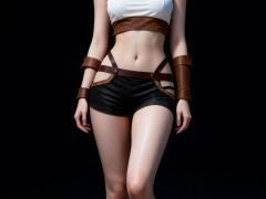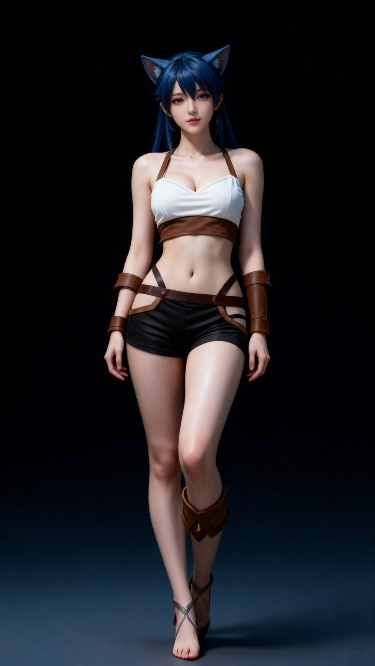 一位年轻亚洲女性,全身像,动漫转真人风格,拥有精致立体的五官,真人比例身材,人物形象参考图2,皮肤白皙细腻,质感通透,面部有细微的高光和阴影,营造出立体的面部轮廓,整体妆容精致自然,背景为深色渐变,突出人物主体,光线柔和均匀,呈现出专业摄影的质感,画面清晰锐利,细节丰富,具有3D渲染的精致效果。