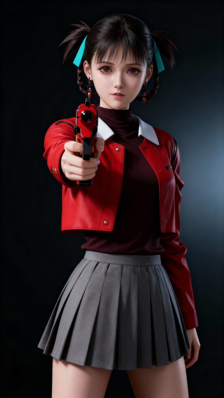 一位年轻亚洲女性,全身像,动漫转真人风格,拥有精致立体的五官,真人比例身材,人物形象参考图2,皮肤白皙细腻,质感通透,面部有细微的高光和阴影,营造出立体的面部轮廓,整体妆容精致自然,背景为深色渐变,突出人物主体,光线柔和均匀,呈现出专业摄影的质感,画面清晰锐利,细节丰富,具有3D渲染的精致效果。