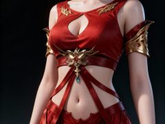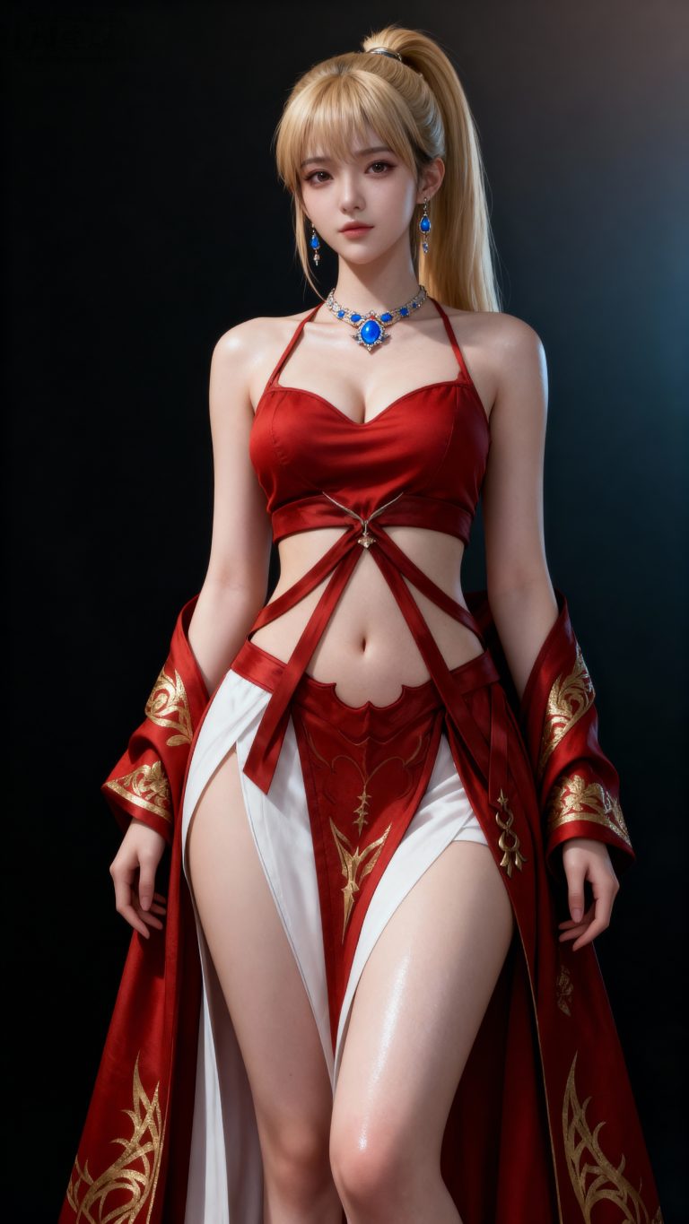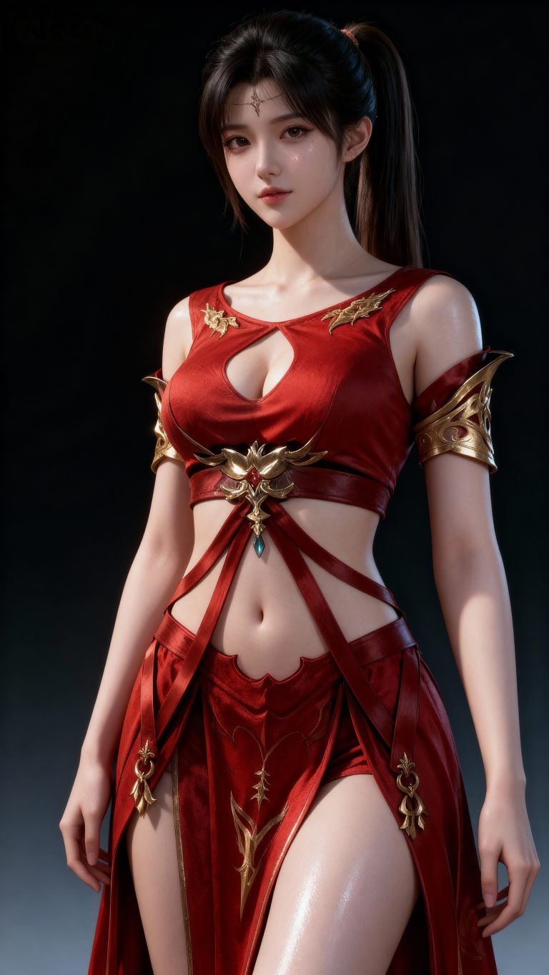 一位年轻亚洲女性,全身像,动漫转真人风格,拥有精致立体的五官,真人比例身材,人物形象参考图2,皮肤白皙细腻,质感通透,面部有细微的高光和阴影,营造出立体的面部轮廓,整体妆容精致自然,背景为深色渐变,突出人物主体,光线柔和均匀,呈现出专业摄影的质感,画面清晰锐利,细节丰富,具有3D渲染的精致效果。