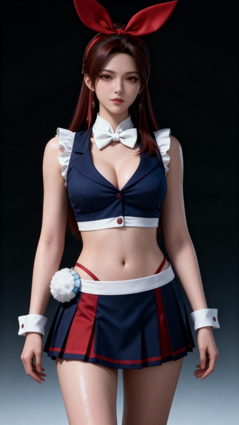 一位年轻亚洲女性,全身像,动漫转真人风格,拥有精致立体的五官,真人比例身材,人物形象参考图2,皮肤白皙细腻,质感通透,面部有细微的高光和阴影,营造出立体的面部轮廓,整体妆容精致自然,背景为深色渐变,突出人物主体,光线柔和均匀,呈现出专业摄影的质感,画面清晰锐利,细节丰富,具有3D渲染的精致效果。