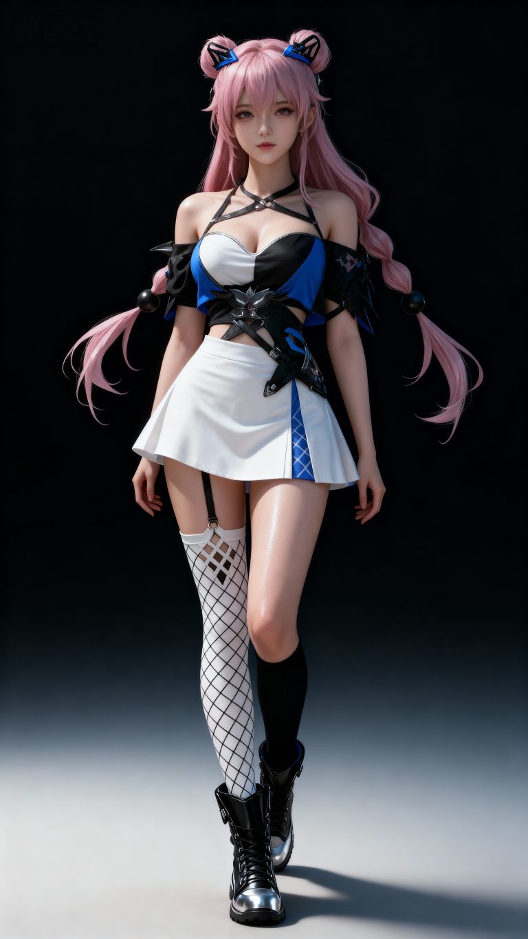 一位年轻亚洲女性,全身像,动漫转真人风格,拥有精致立体的五官,真人比例身材,人物形象参考图2,皮肤白皙细腻,质感通透,面部有细微的高光和阴影,营造出立体的面部轮廓,整体妆容精致自然,背景为深色渐变,突出人物主体,光线柔和均匀,呈现出专业摄影的质感,画面清晰锐利,细节丰富,具有3D渲染的精致效果。