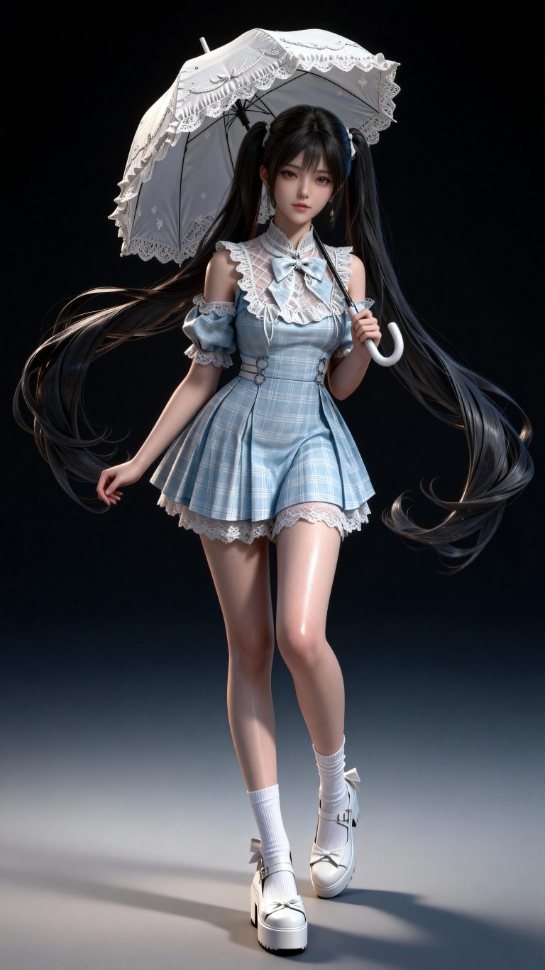 一位年轻亚洲女性,全身像,动漫转真人风格,拥有精致立体的五官,真人比例身材,人物形象参考图2,皮肤白皙细腻,质感通透,面部有细微的高光和阴影,营造出立体的面部轮廓,整体妆容精致自然,背景为深色渐变,突出人物主体,光线柔和均匀,呈现出专业摄影的质感,画面清晰锐利,细节丰富,具有3D渲染的精致效果。