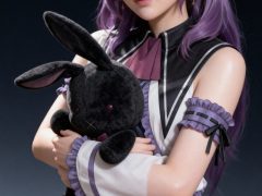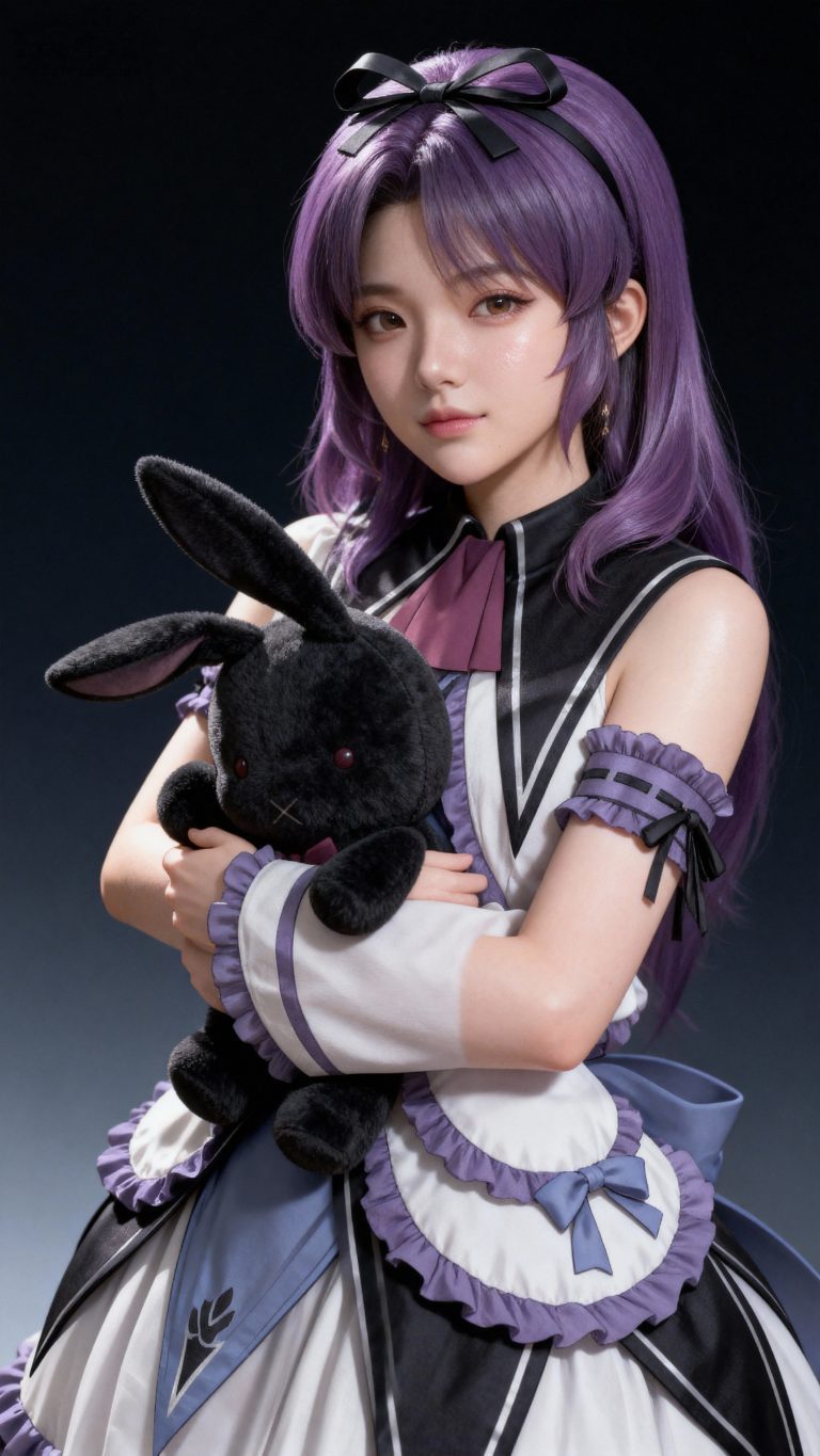 一位年轻亚洲女性,全身像,动漫转真人风格,拥有精致立体的五官,真人比例身材,人物形象参考图2,皮肤白皙细腻,质感通透,面部有细微的高光和阴影,营造出立体的面部轮廓,整体妆容精致自然,背景为深色渐变,突出人物主体,光线柔和均匀,呈现出专业摄影的质感,画面清晰锐利,细节丰富,具有3D渲染的精致效果。