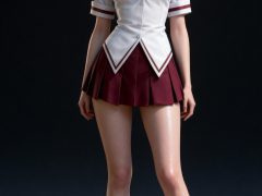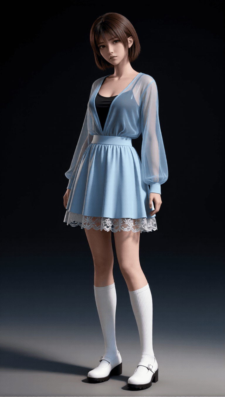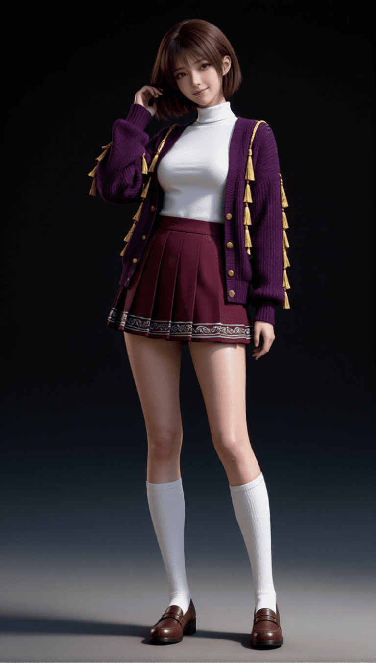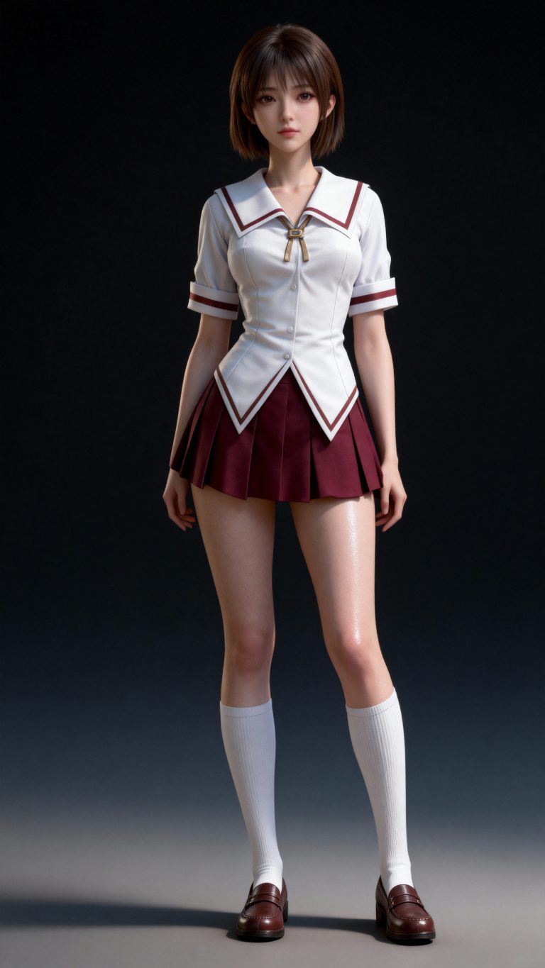 一位年轻亚洲女性,全身像,动漫转真人风格,拥有精致立体的五官,真人比例身材,人物形象参考图2,皮肤白皙细腻,质感通透,面部有细微的高光和阴影,营造出立体的面部轮廓,整体妆容精致自然,背景为深色渐变,突出人物主体,光线柔和均匀,呈现出专业摄影的质感,画面清晰锐利,细节丰富,具有3D渲染的精致效果。