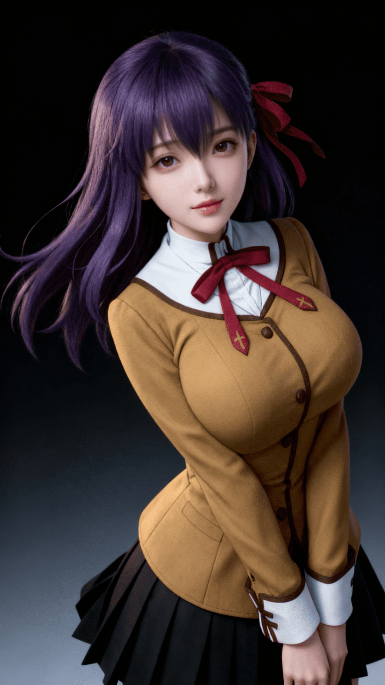 一位年轻亚洲女性,全身像,动漫转真人风格,拥有精致立体的五官,真人比例身材,人物形象参考图2,皮肤白皙细腻,质感通透,朦胧的光照,整体妆容精致自然,背景为深色渐变,突出人物主体,光线柔和均匀,呈现出专业摄影的质感,画面清晰锐利,细节丰富,具有3D渲染的精致效果。