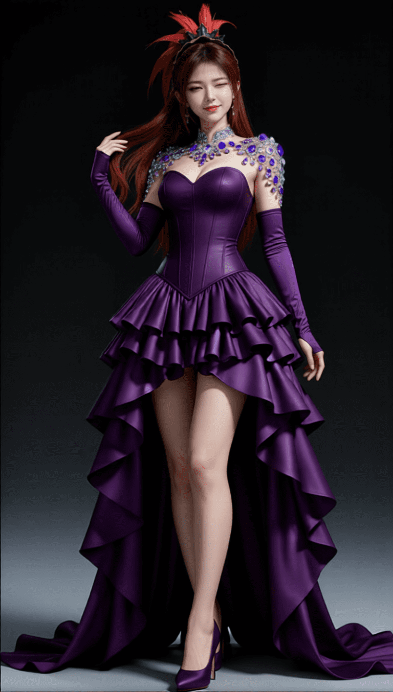 一位年轻亚洲女性,全身像,动漫转真人风格,拥有精致立体的五官,真人比例身材,人物形象参考图2,皮肤白皙细腻,质感通透,朦胧的光照,整体妆容精致自然,背景为深色渐变,突出人物主体,光线柔和均匀,呈现出专业摄影的质感,画面清晰锐利,细节丰富,具有3D渲染的精致效果。