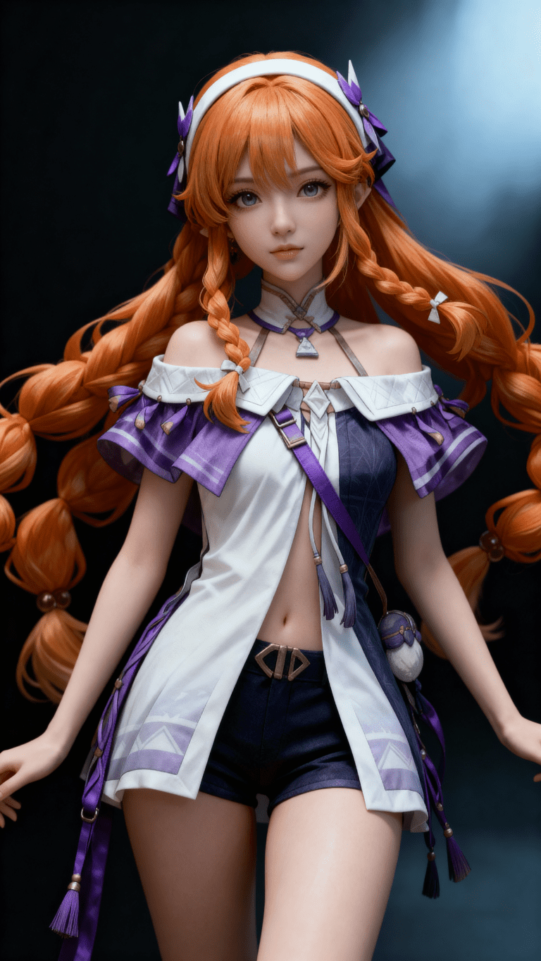 一位年轻亚洲女性,全身像,动漫转贞本义行风格,拥有精致立体的五官,真人比例身材,人物形象参考图2,皮肤白皙细腻,质感通透,朦胧的光照,整体妆容精致自然,背景为深色渐变,突出人物主体,光线柔和朦胧,呈现出专业摄影的质感,画面清晰,细节丰富,具有3D渲染的精致效果。