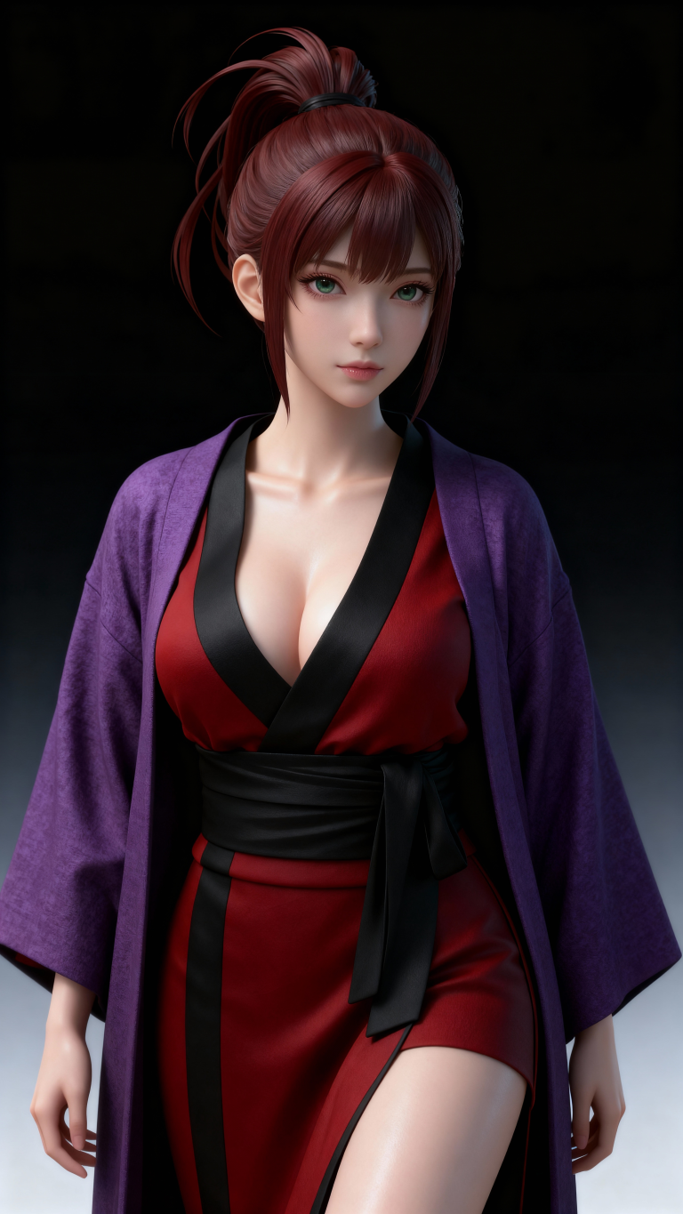 一位年轻亚洲女性,全身像,动漫转贞本义行风格,拥有精致立体的五官,真人比例身材,人物形象参考图2,皮肤白皙细腻,质感通透,朦胧的光照,整体妆容精致自然,背景为深色渐变,突出人物主体,光线柔和朦胧,呈现出专业摄影的质感,画面清晰,细节丰富,具有3D渲染的精致效果。