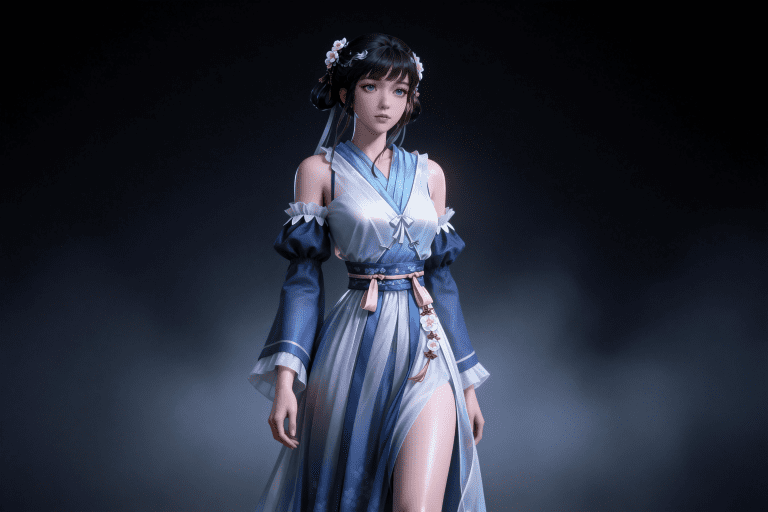 一位年轻亚洲女性,全身像,动漫转贞本义行风格,拥有精致立体的五官,真人比例身材,人物形象参考图2,皮肤白皙细腻,质感通透,朦胧的光照,整体妆容精致自然,背景为深色渐变,突出人物主体,光线柔和朦胧,呈现出专业摄影的质感,画面清晰,细节丰富,具有3D渲染的精致效果。