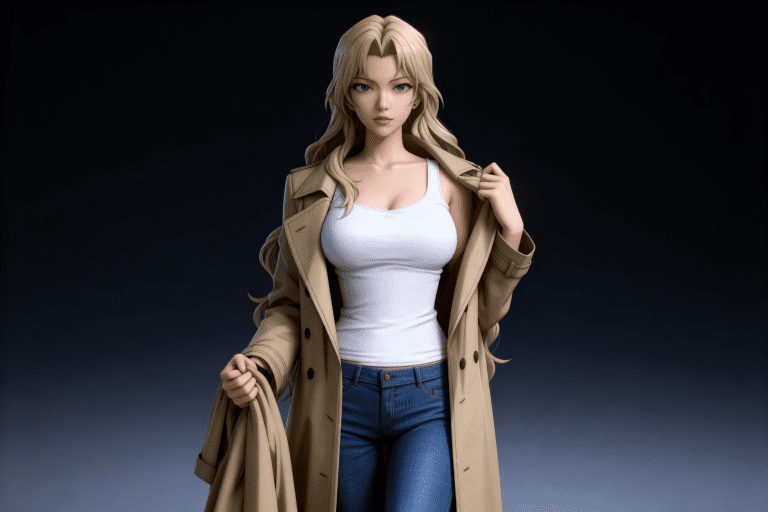 一位年轻亚洲女性,全身像,动漫转贞本义行风格,拥有精致立体的五官,真人比例身材,人物形象参考图2,皮肤白皙细腻,质感通透,整体妆容精致自然,背景为深色渐变,突出人物主体,光线柔和,呈现出专业摄影的质感,画面清晰,细节丰富,具有3D渲染的精致效果。清晰的画面风格,高超清。