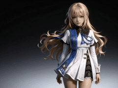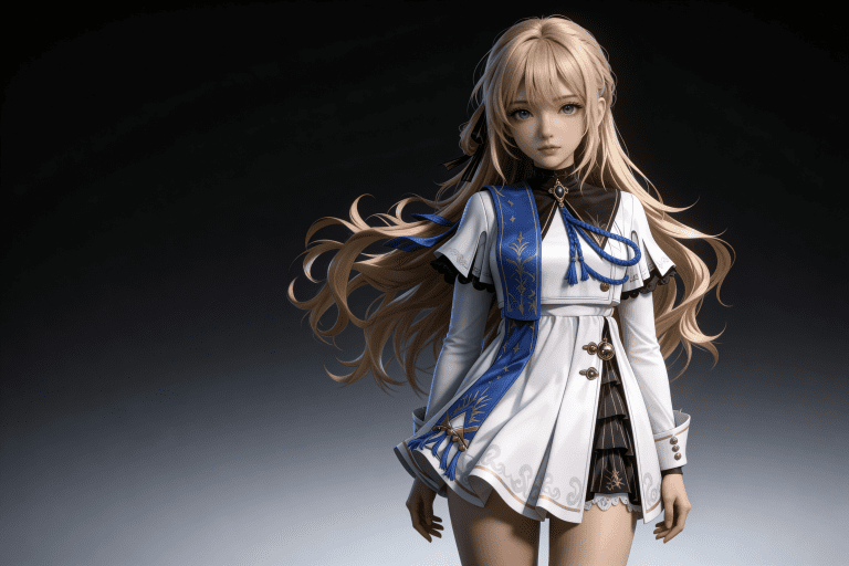 一位年轻亚洲女性,全身像,动漫转贞本义行风格,拥有精致立体的五官,真人比例身材,人物形象参考图2,皮肤白皙细腻,质感通透,整体妆容精致自然,背景为深色渐变,突出人物主体,光线柔和,呈现出专业摄影的质感,画面清晰,细节丰富,具有3D渲染的精致效果。清晰的画面风格,高超清。