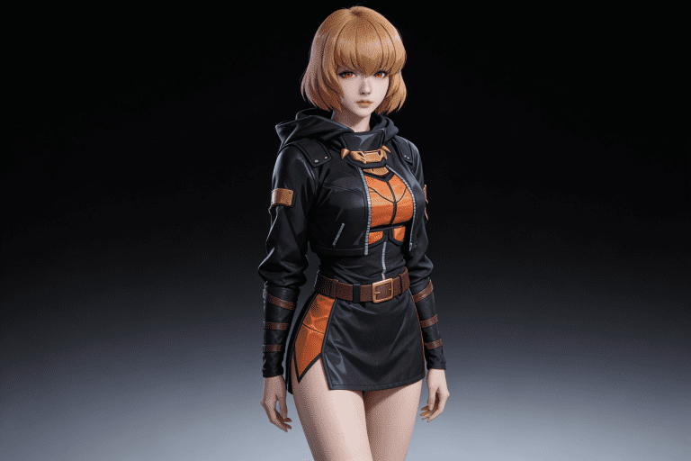 一位年轻亚洲女性,全身像,动漫转贞本义行风格,拥有精致立体的五官,真人比例身材,人物形象参考图2,皮肤白皙细腻,质感通透,整体妆容精致自然,背景为深色渐变,突出人物主体,光线柔和,呈现出专业摄影的质感,画面清晰,细节丰富,具有3D渲染的精致效果。清晰的画面风格,高超清。真实皮肤风格。UE5效果。