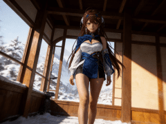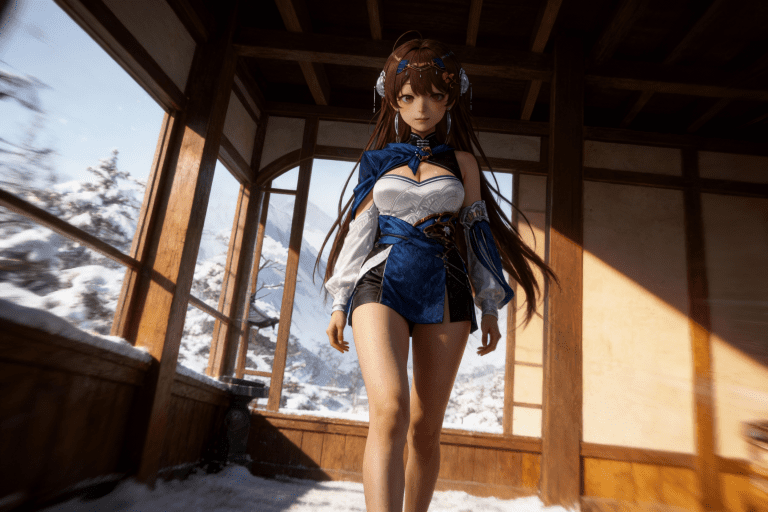 写实风格,写真风格,真人皮肤,真人建模脸,超高分辨率,全身女,冷酷漠视,动态模糊,广角景深,低亮度,灿烂温暖,ue5渲染,强对比,电影级特效,高挑修长,日系风格,顺光伦勃朗光,明亮背景。