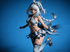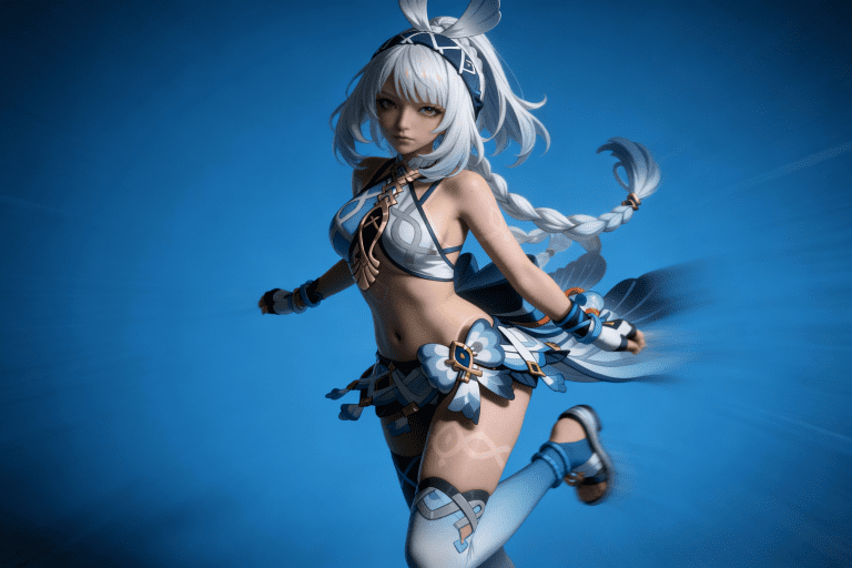 写实风格,写真风格,真人皮肤,3d建模脸,超高分辨率,全身女,冷酷漠视,动态模糊,广角景深,高亮度,ue5渲染,强对比,电影级特效,高挑修长,日系风格,正面光照,纯色蓝色背景。