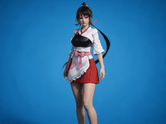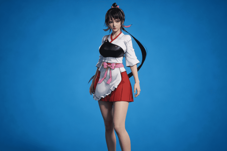 人物形象参考图2,写实风格,写真风格,真人皮肤,真人3d建模脸,超高分辨率,全身女,冷酷漠视,广角景深,高亮度,ue5渲染,强对比,电影级特效,高挑修长,日系风格,纯色蓝色背景。