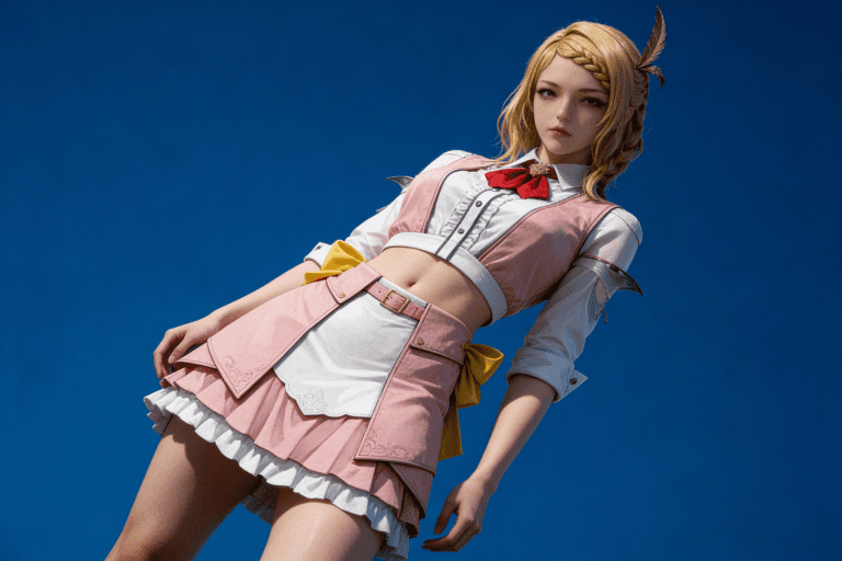 人物形象参考图2,写实风格,写真风格,真人皮肤,真人3d建模脸,超高分辨率,全身女,冷酷漠视,广角景深,高亮度,ue5渲染,强对比,电影级特效,高挑修长,日系风格,纯色蓝色背景。