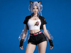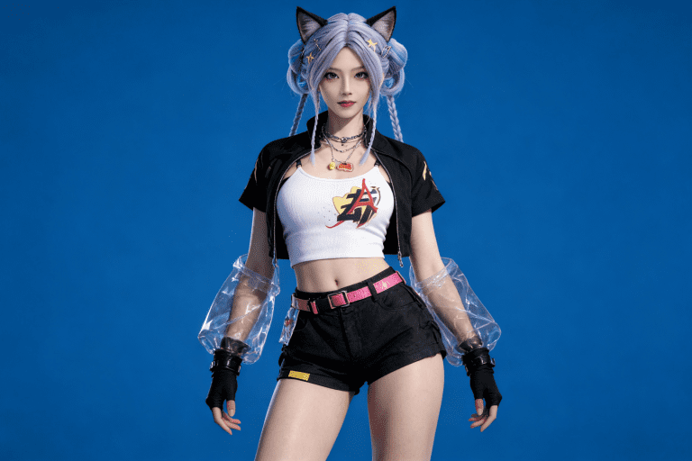 人物形象参考图2,写实风格,写真风格,真人皮肤,真人3d建模脸,超高分辨率,全身女,冷酷漠视,广角景深,高亮度,ue5渲染,强对比,电影级特效,高挑修长,日系风格,纯色蓝色背景。