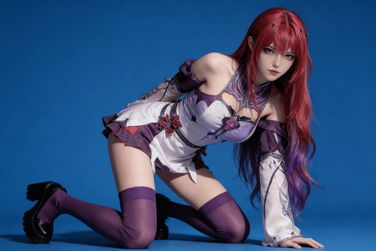 人物形象参考图2,写实风格,写真风格,真人皮肤,真人3d建模脸,超高分辨率,全身女,冷酷漠视,广角景深,高亮度,ue5渲染,强对比,电影级特效,高挑修长,日系风格,纯色蓝色背景。