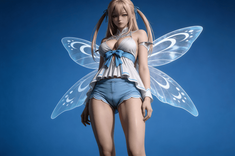 人物形象参考图2,写实风格,写真风格,真人皮肤,真人3d建模脸,超高分辨率,全身女,冷酷漠视,广角景深,高亮度,ue5渲染,强对比,电影级特效,高挑修长,日系风格,纯色蓝色背景。
