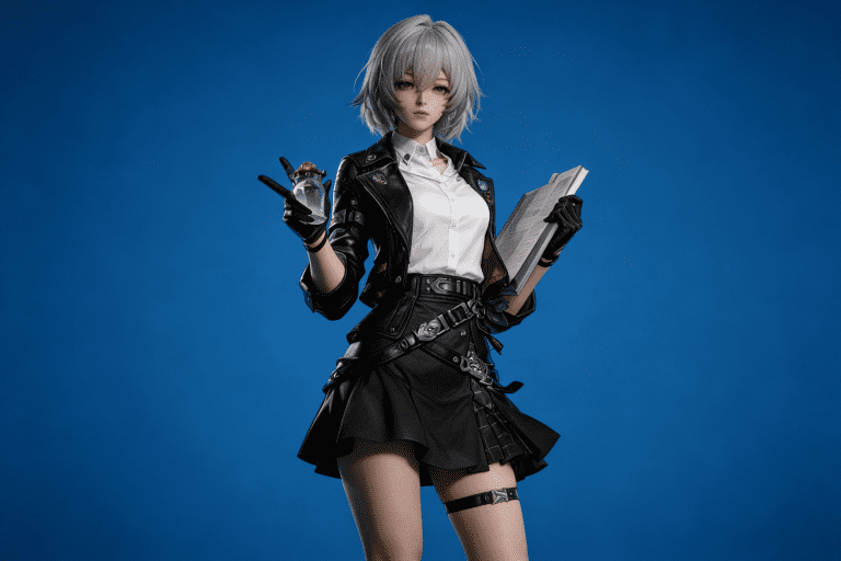 人物形象参考图2,写实风格,写真风格,真人皮肤,真人3d建模脸,超高分辨率,全身女,冷酷漠视,广角景深,高亮度,ue5渲染,强对比,电影级特效,高挑修长,日系风格,纯色蓝色背景。