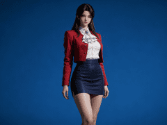 人物形象参考图2,写实风格,写真风格,真人皮肤,真人3d建模脸,超高分辨率,全身女,冷酷漠视,广角景深,高亮度,ue5渲染,强对比,电影级特效,高挑修长,日系风格,纯色蓝色背景。