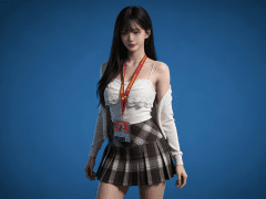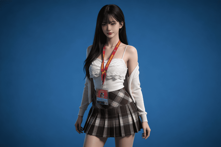 人物形象参考图2,写实风格,写真风格,真人皮肤,真人3d建模脸,超高分辨率,全身女,冷酷漠视,广角景深,高亮度,ue5渲染,强对比,电影级特效,高挑修长,日系风格,纯色蓝色背景。