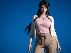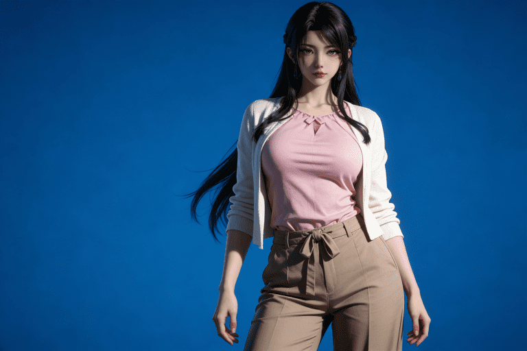 人物形象参考图2,写实风格,写真风格,真人皮肤,真人3d建模脸,超高分辨率,全身女,冷酷漠视,广角景深,高亮度,ue5渲染,强对比,电影级特效,高挑修长,日系风格,纯色蓝色背景。