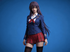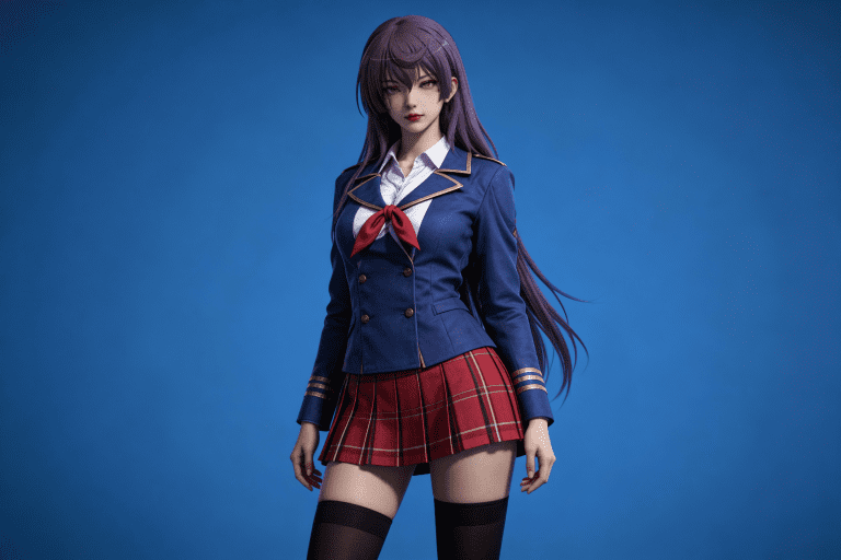 人物形象参考图2,写实风格,写真风格,真人皮肤,真人3d建模脸,超高分辨率,全身女,冷酷漠视,广角景深,高亮度,ue5渲染,强对比,电影级特效,高挑修长,日系风格,纯色蓝色背景。
