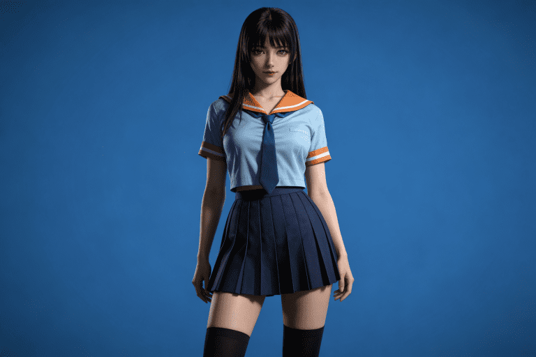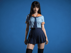 人物形象参考图2,写实风格,写真风格,真人皮肤,真人3d建模脸,超高分辨率,全身女,冷酷漠视,广角景深,高亮度,ue5渲染,强对比,电影级特效,高挑修长,日系风格,纯色蓝色背景。