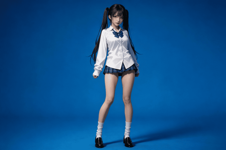 人物形象参考图2,写实风格,写真风格,真人皮肤,真人3d建模脸,超高分辨率,全身女,冷酷漠视,广角景深,高亮度,ue5渲染,强对比,电影级特效,高挑修长,日系风格,纯色蓝色背景。