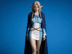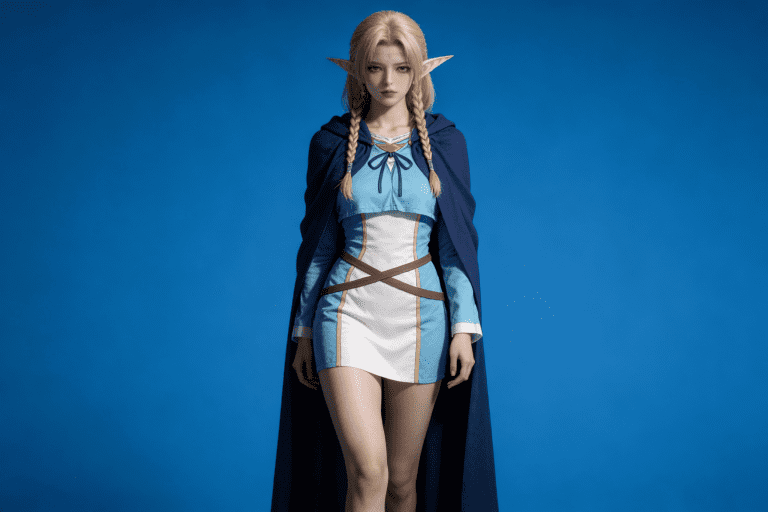 人物形象参考图2,写实风格,写真风格,真人皮肤,真人3d建模脸,超高分辨率,全身女,冷酷漠视,广角景深,高亮度,ue5渲染,强对比,电影级特效,高挑修长,日系风格,纯色蓝色背景。