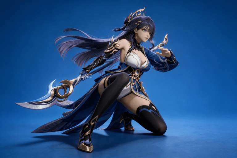 人物形象参考图2,写实风格,写真风格,真人皮肤,真人3d建模脸,超高分辨率,全身女,冷酷漠视,广角景深,高亮度,ue5渲染,强对比,电影级特效,高挑修长,日系风格,纯色蓝色背景。