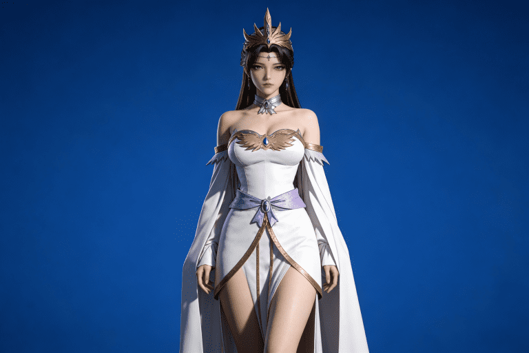 人物形象参考图2,写实风格,写真风格,真人皮肤,真人3d建模脸,超高分辨率,全身女,冷酷漠视,广角景深,高亮度,ue5渲染,强对比,电影级特效,高挑修长,日系风格,纯色蓝色背景。