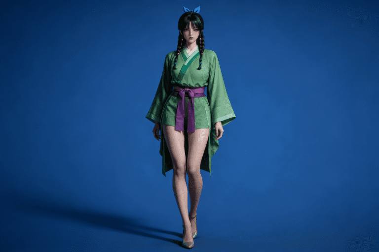 人物形象参考图2,写实风格,写真风格,真人皮肤,真人3d建模脸,超高分辨率,全身女,冷酷漠视,广角景深,高亮度,ue5渲染,强对比,电影级特效,高挑修长,日系风格,纯色蓝色背景。