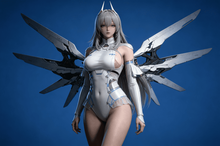 人物形象参考图2,写实风格,写真风格,真人皮肤,真人3d建模脸,超高分辨率,全身女,冷酷漠视,广角景深,高亮度,ue5渲染,强对比,电影级特效,高挑修长,日系风格,纯色蓝色背景。
